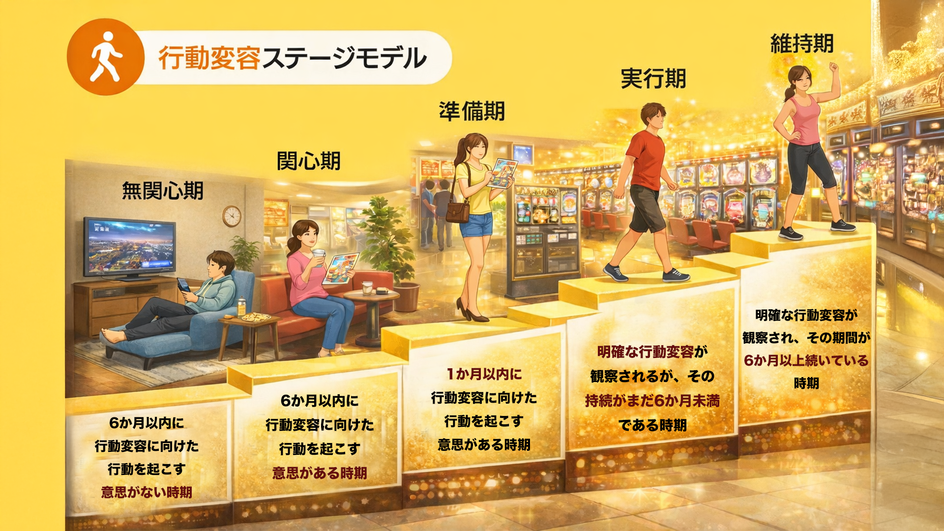 行動は、ある日突然変わらない ――店内プロモーションと「行動変容ステージモデル」 パチンコ業界において「良い企画なのに増客に繋がらない」 「伝えているはずなのに反応が薄い」と感じる場面は…